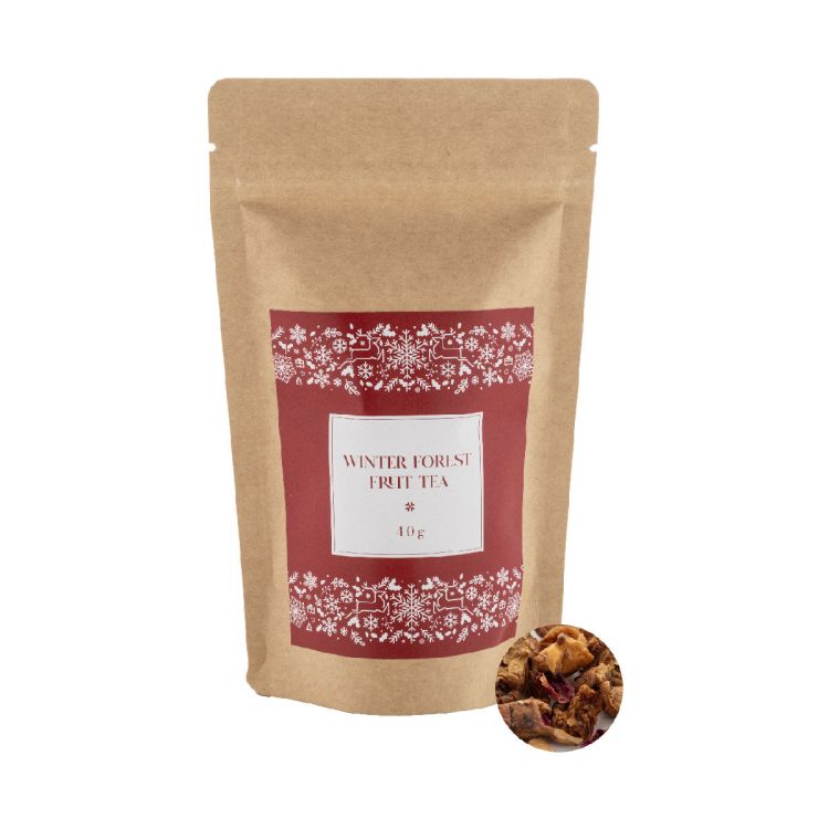 Waldfrüchte-Wintertee als loser Blatttee, verpackt in einer natürlichen Kraftpapiertüte. 40 Gramm