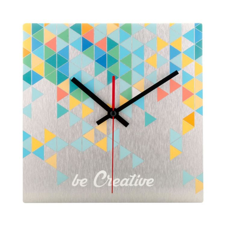 Individuelle, quadratische Wanduhr aus gebürstetem Aluminiumverbund mit individueller Bedruckung. Der Preis ist inklusive UV LED Druck. Mindestmenge: 25 Stk. Exkl. Batterie (1 x AA)