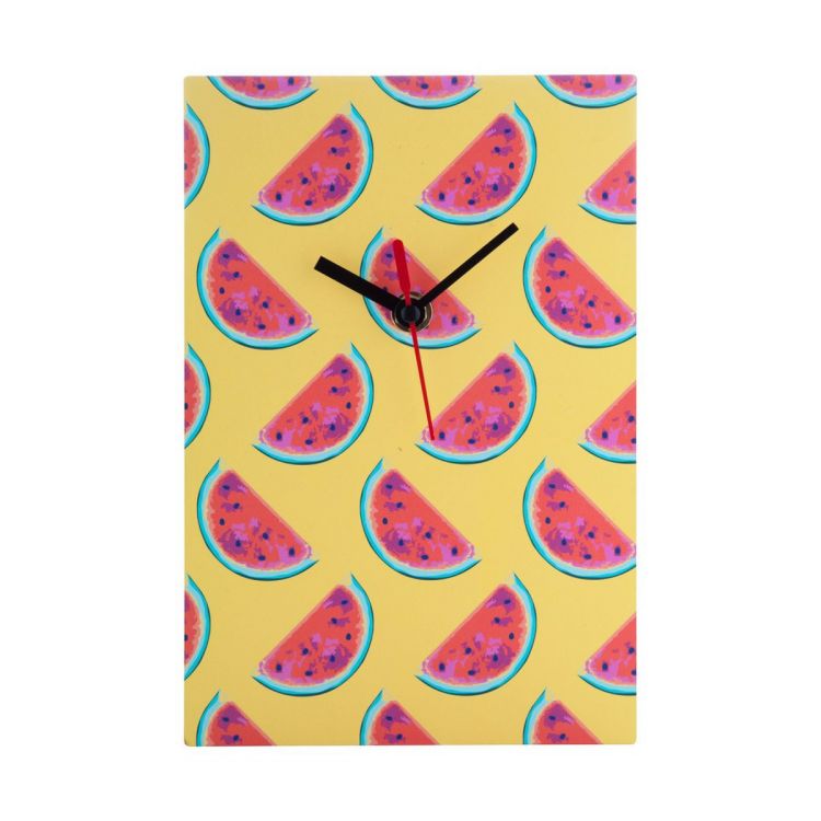 Rechteckige Wanduhr aus Holz mit Vollfarbdruck. Preis inkl. UV LED Druck. Exkl. Batterie (1 x AA). Mindestmenge: 50 Stk