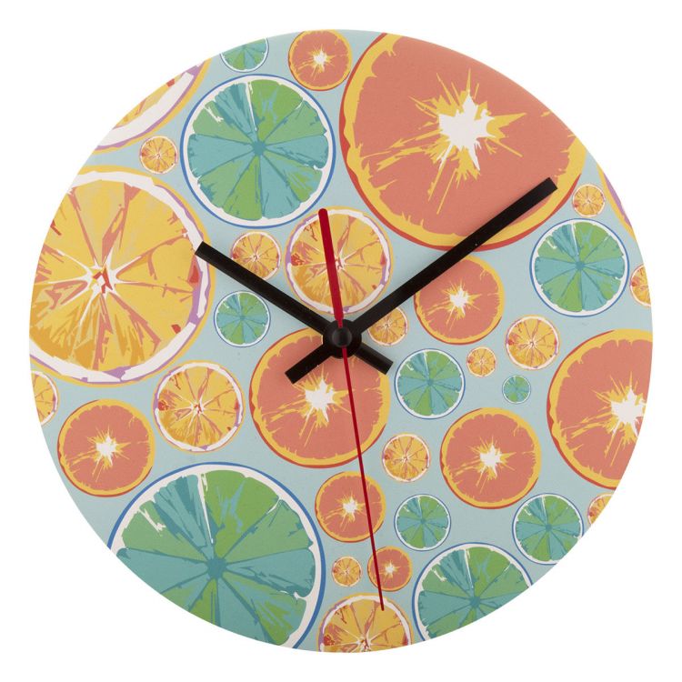 Runde Wanduhr aus Holz mit Vollfarbdruck. Preis inkl. UV LED Druck. Exkl. Batterie (1 x AA). Mindestmenge: 50 Stk