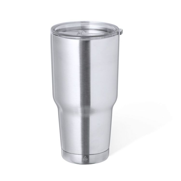 Thermobecher aus recyceltem doppelwandigem Edelstahl mit einem Fassungsvermögen von 800 ml. Mit Spender im Deckel, leicht zu öffnen, BPA-frei, in silberner Ausführung. Es ist ideal für Ihren Schreibtisch, Tisch oder jede andere Oberfläche, auf der Sie in Ruhe Ihr Lieblingsgetränk genießen können. Mit Recycled Stainless Steel-Logo. Stahl ist eines der gefragtesten Materialien und kann fast überall gefunden werden, von Alltagsprodukten bis hin zu großen Konstruktionen. Mit unzähligen Eigenschaften, unter denen die Haltbarkeit und der hohe Wiederverwendungsgrad hervorzuheben sind, ist es eine geschätzte Alternative zu Nachhaltigkeitslösungen. Richtig behandelt, ermöglicht es neue Ressourcen, die unendlich genutzt werden. (silber farbe)