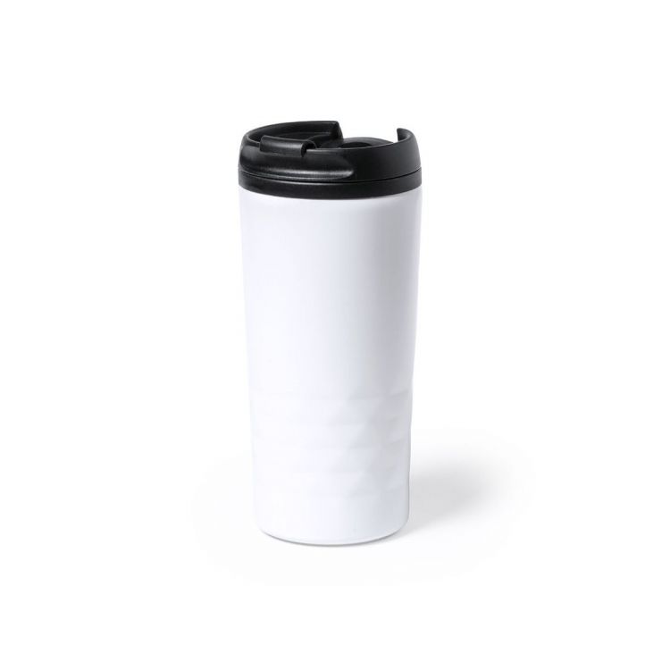Edelstahl-Trinkbecher mit 310 ml Fassungsvermögen. Mit leicht zu öffnendem Spenderdeckel und weichem, schaumgepolstertem Boden. Es ist ideal für Ihren Schreibtisch, Tisch oder jede andere Oberfläche, auf der Sie in Ruhe Ihr Lieblingsgetränk genießen können. Mit origineller Hochglanzoberfläche und Rautendesign.