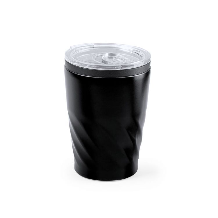 Trinkbecher aus rostfreiem Stahl mit einem Fassungsvermögen von 350 ml. Konisches Design mit schwarzem Ring. Mit origineller transparenter Spenderkappe und Easy-Opener. Es ist ideal für Ihren Schreibtisch, Tisch oder jede andere Oberfläche, auf der Sie in Ruhe Ihr Lieblingsgetränk genießen können.