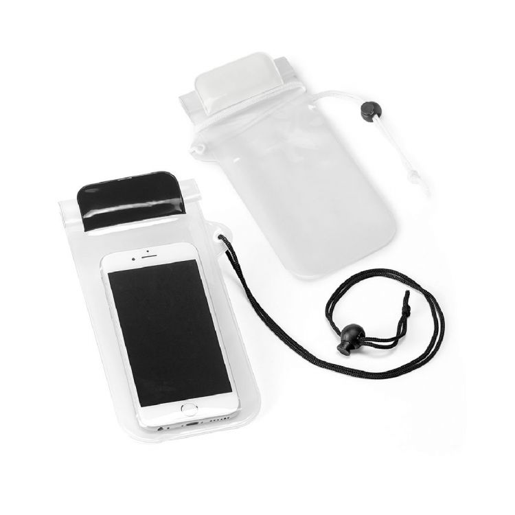 Handyhülle aus PVC mit einem verstellbarem Band mit Stopper, luftdichtem Verschluss und einer Lasche mit Klettverschluss. Die Vorderseite ist transparent und die Rückseite mattweiß. Diese Hülle ist wasserdicht und ermöglicht die Nutzung des Smartphones