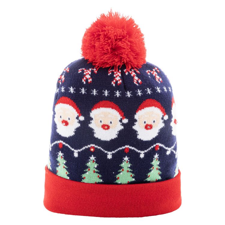 Gestrickte Weihnachtsmütze aus Acryl mit 6 LED-Leuchten (3 Leuchtmodi), Bündchen und Bommel. Mit Knopfzellenbatterie