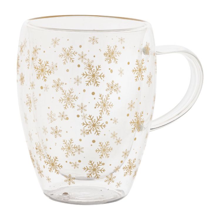 Doppelwandiger Thermobecher aus Borosilikatglas mit weihnachtlichem Schneeflockendesign. Füllmenge: 350 ml. Einzeln in Kraftpapier-Box