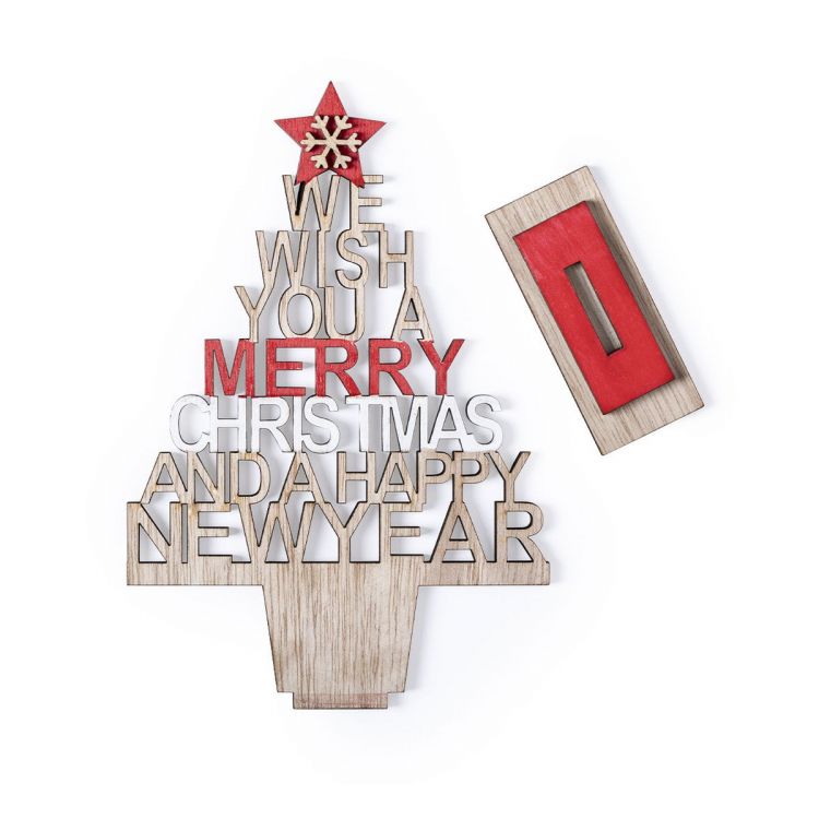 Auffälliger, hölzerner Weihnachtsbaum mit gestanzter Botschaft. Mit einer breiten Druckfläche, abnehmbarem Sockel und in einer individuellen Schachtel präsentiert. (natürlich farbe)