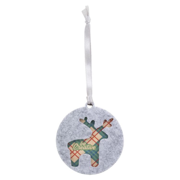 Individueller, zweilagiger Weihnachtsbaumanhänger aus RPET-Filz und Birkensperrholz mit silberner Schleife und gestanztem Weihnachtsmotiv. Der Preis ist inklusive UV-LED-Druck auf dem Holzteil. Mindestmenge: 100 Stk
