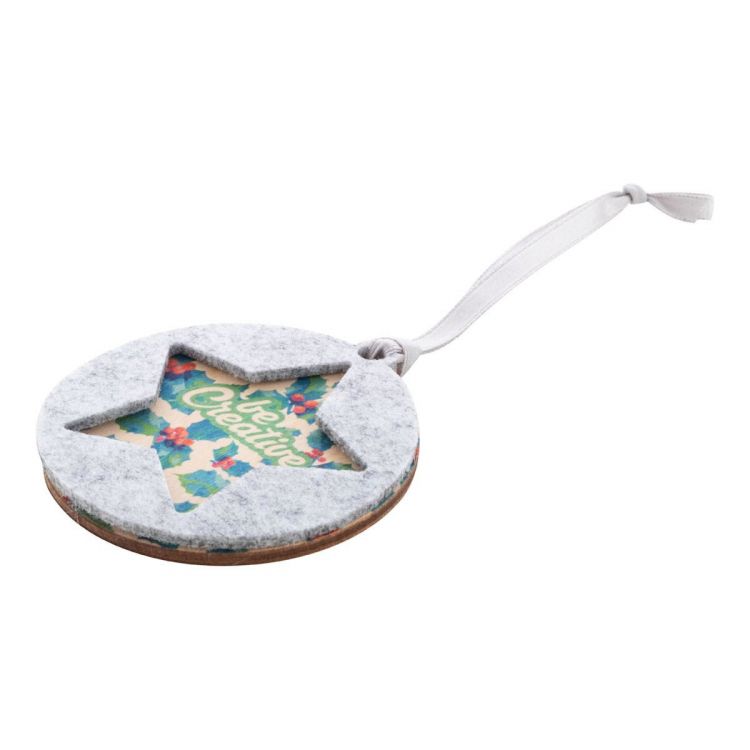 Individueller, zweilagiger Weihnachtsbaumanhänger aus RPET-Filz und Birkensperrholz mit silberner Schleife und gestanztem Weihnachtsmotiv. Der Preis ist inklusive UV-LED-Druck auf dem Holzteil. Mindestmenge: 100 Stk