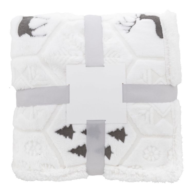 Hochwertige doppellagige RPET-Weihnachtsdecke mit geprägtem Wintermotiv. Material: 270 g/m² RPET-Flanellfleece und wendbarem 210 g/m² RPET-Sherpafleece-Futter. Mit Schleife und bedruckbarer Geschenkkarte aus Papier, in grau farbe