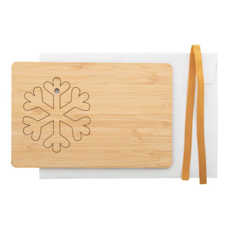 Weihnachtskarte aus Bambussperrholz mit ausgestanztem Weihnachtsbaumschmuck mit goldenem Band (separat beiliegend). Inkl. C6-Briefumschlag