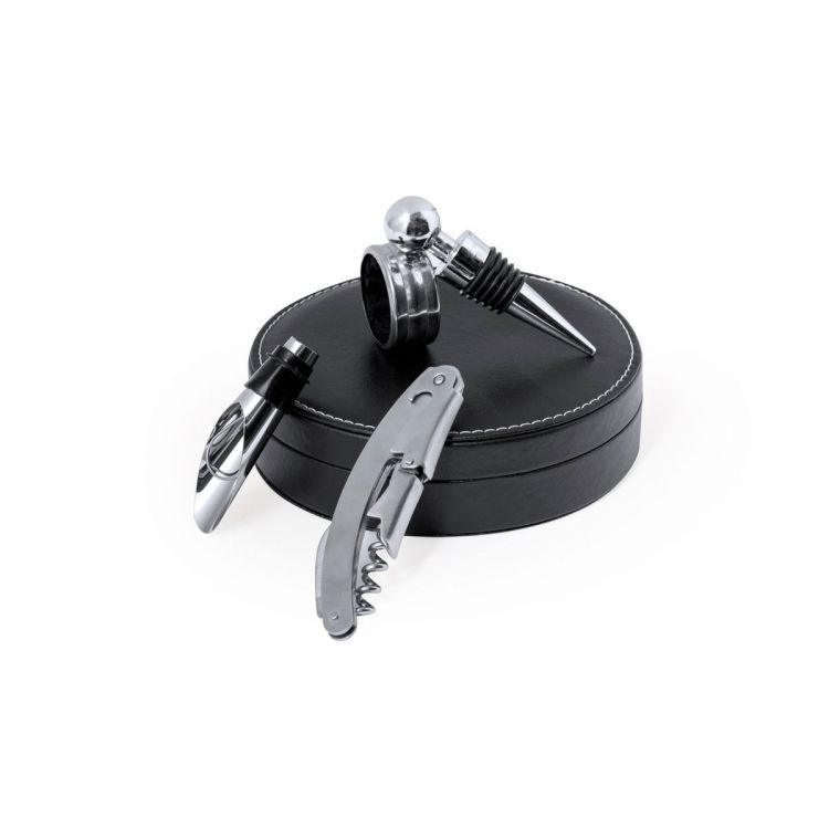 Weinset mit elegantem, rundem Design aus PU-Leder und Zubehör aus Edelstahl. Inklusive 2-Hebel-Korkenzieher mit Kapselschneider, Stopfen, Dosierer und Tropfstopper. (schwarz farbe)