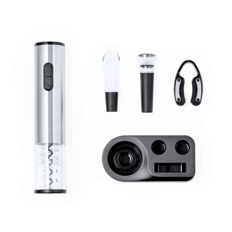 Praktisches Weinset mit 4 Zubehörteilen. Enthält einen elektrischen Korkenzieher mit 4 AAA-Batterien (nicht im Lieferumfang enthalten), eine Karaffe, einen Deckel und einen Kapselschneider mit Aufsteckmechanismus. Inklusive einer eleganten schwarzen Basis, um die Accessoires ordentlich aufzubewahren. Präsentiert in einer Kraft-Design-Box. (natürlich farbe)