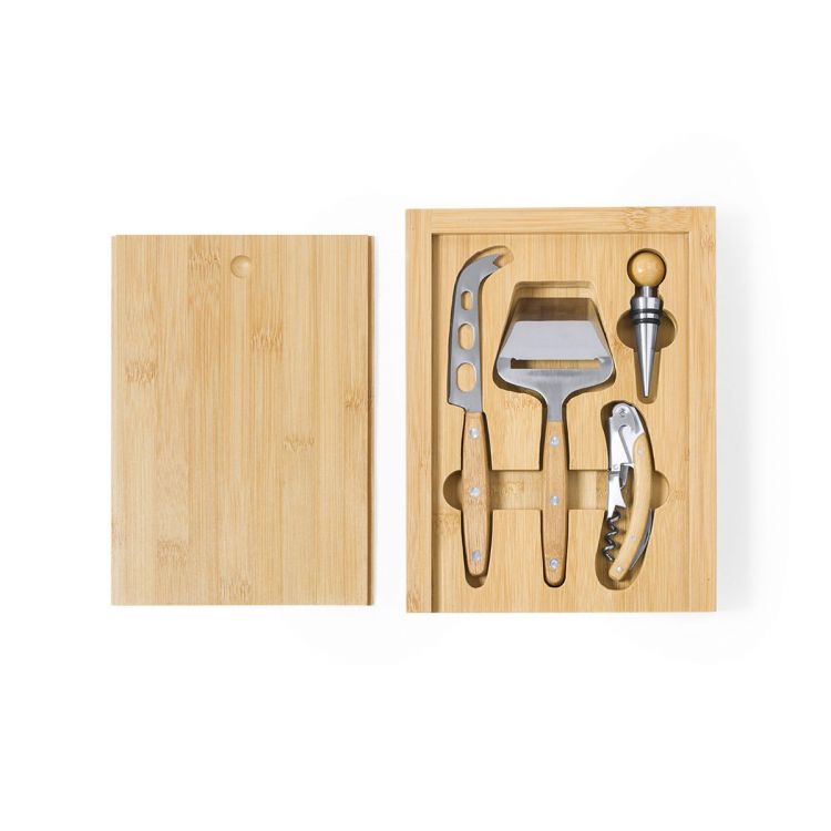 Ultimatives Wein- und Käseset aus 4 Teilen. Hergestellt aus Bambus, mit Schneidebrett Abdeckung und Metall-Zubehör mit Bambusgriff. Einschließlich Korkenzieher, Deckel, Messer und Käsereibe. Präsentiert in einer individuellen Ökodesign-Box. (natürlich farbe)