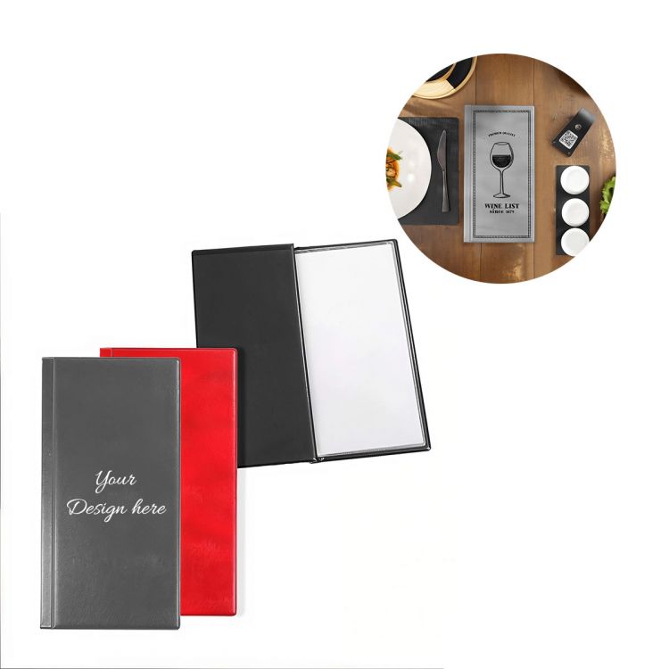 Weinmappe mit Umschlag aus Kunstleder mit vorgeschweißtem, breit geripptem Rand. Innen 8 transparente Umschläge.