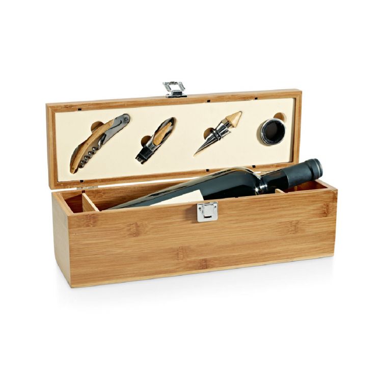 Weinkasten aus Bambus, ABS und Edelstahl. Dieses Set besteht aus einer Weinbox, einem Sommeliermesser mit Korkenzieher, einem Ausgießer, einem Tropfenfänger und einem Korken. Da das Produkt aus natürlichen Materialien hergestellt wird, können Farbe des Produkts sowie das Druckergebnis von Produkt zu Produkt unterschiedlich sein, in natürlich farbe
