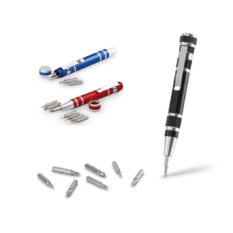 Werkzeug aus Metall im Kugelschreiberformat mit 8 unterschiedlichen abnehmbaren Bits. Praktisches Werkzeug mit Clip und Aufbewahrungsmöglichkeit der Bits im Innenraum des Gehäuses. Geliefert in einer Schachtel