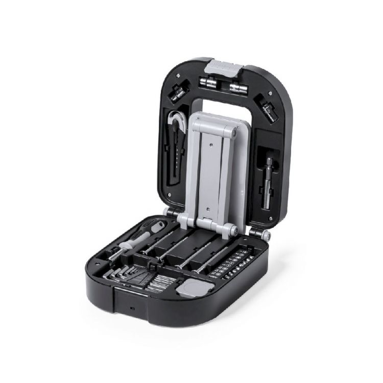 Original Werkzeugset mit Licht und 30 Zubehörteilen. Wird in einer robusten schwarzen ABS-Box mit Verschluss geliefert. In der Box integrierte, faltbare Lampe mit 24 LEDs und EIN/AUS-Taste. Inklusive Schraubendreher mit vielen flachen, Phillips- und Torx-Spitzen, Präzisionsschraubendreher-Set, Rohrschlüssel, Inbusschlüssel in verschiedenen Größen, Schneider und 1 m Flexometer. Batteriebetriebene Lampe (3xAA nicht im Lieferumfang enthalten). Präsentiert in einer individuellen Box mit Kraftpapier-Design. (schwarz farbe)