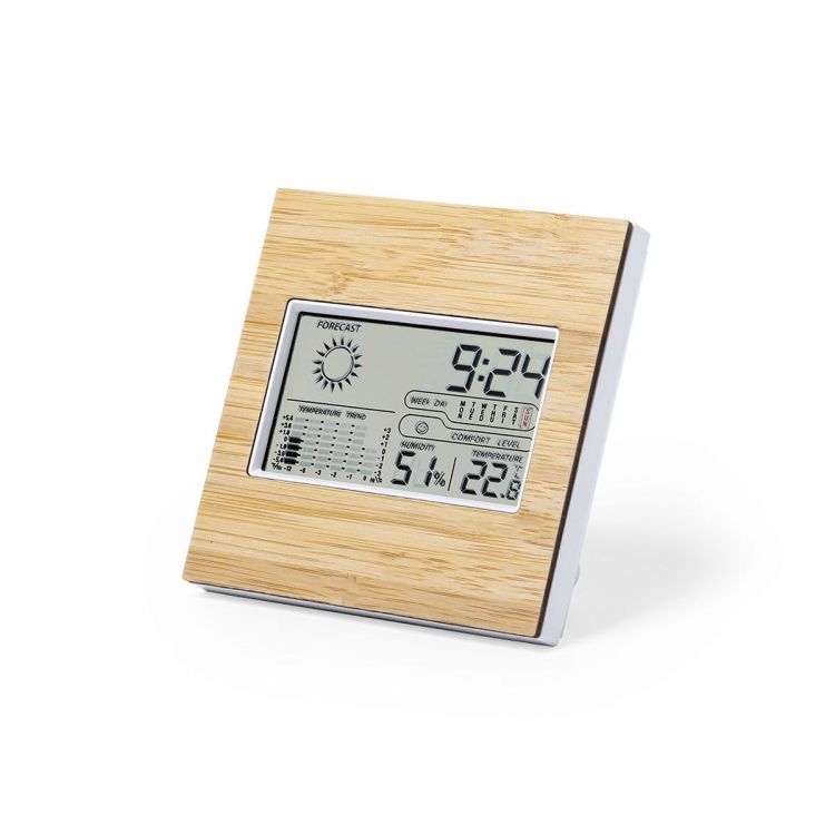 Nature Line Wetterstation mit Bambusfront. Mit Temperatur- und Feuchtigkeitssensor. Kalender- und Alarmfunktion. Klappbare und verstellbare hintere Stütze, mit der Möglichkeit der Wandmontage. Batteriebetrieben (2xAAA nicht im Lieferumfang enthalten) und präsentiert in einer attraktiven Öko-Design-Box. Gebrauchsanweisung in Englisch und Spanisch verfügbar. (natürlich farbe)