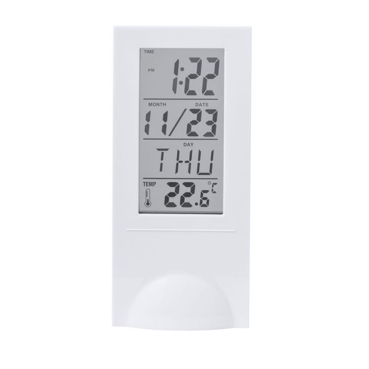 Wetterstation aus widerstandsfähigem ABS, mit Temperatursensor. Zeitfunktion (12/24), Kalender, Alarm und Wochentag. Mit Sockel/Halterung und hinteren Bedientasten. Batteriebetrieben (2xAAA nicht im Lieferumfang enthalten) und präsentiert in einer attraktiven Kraft-Design-Box. Gebrauchsanweisung in Englisch und Spanisch. (weiß farbe)