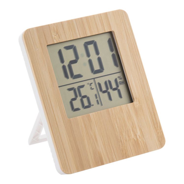 Wetterstation und Digitaluhr mit Bambus-Verkleidung. Funktionen: Wecker, Kalender, Thermometer und Luftfeuchtigkeitsanzeige. Betrieb mit 2 AAA-Batterien, Lieferung ohne Batterie