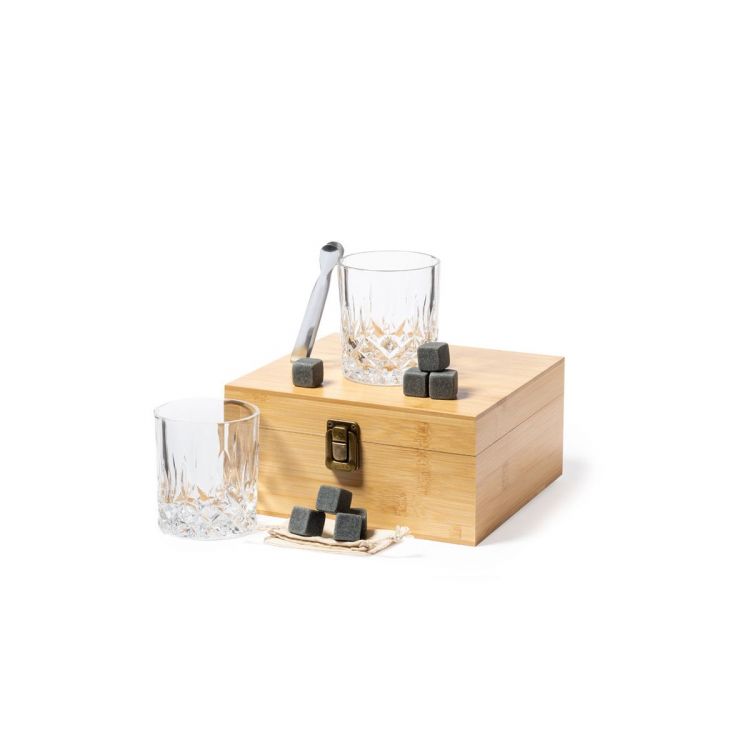 Whisky-Set im eleganten Bambus-Etui mit gestanzter Innenseite. Enthält 2 x 320ml Kristallgläser, Pinzette und 8 wiederverwendbare Natursteinwürfel, im Baumwollbeutel. Präsentiert in einer individuellen Kraftbox.Die wiederverwendbaren Eiswürfel bestehen aus natürlichem Speckstein, auch bekannt als Speckstein oder Speckstein, der das Getränk kalt hält, ohne seine Eigenschaften zu verändern, indem er seinen Inhalt nicht mit Wasser verdünnt, und seinen ursprünglichen Geschmack beibehält. (natürlich farbe)