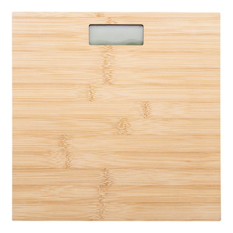 Digitale Personenwaage mit Wiegefläche aus Bambus. Tragkraft: 150kg, Einteilung: 0,1kg, Maßeinheiten: kg/lb/st. Mit integriertem, wiederaufladbarem Akku. Inklusive USB-Ladekabel