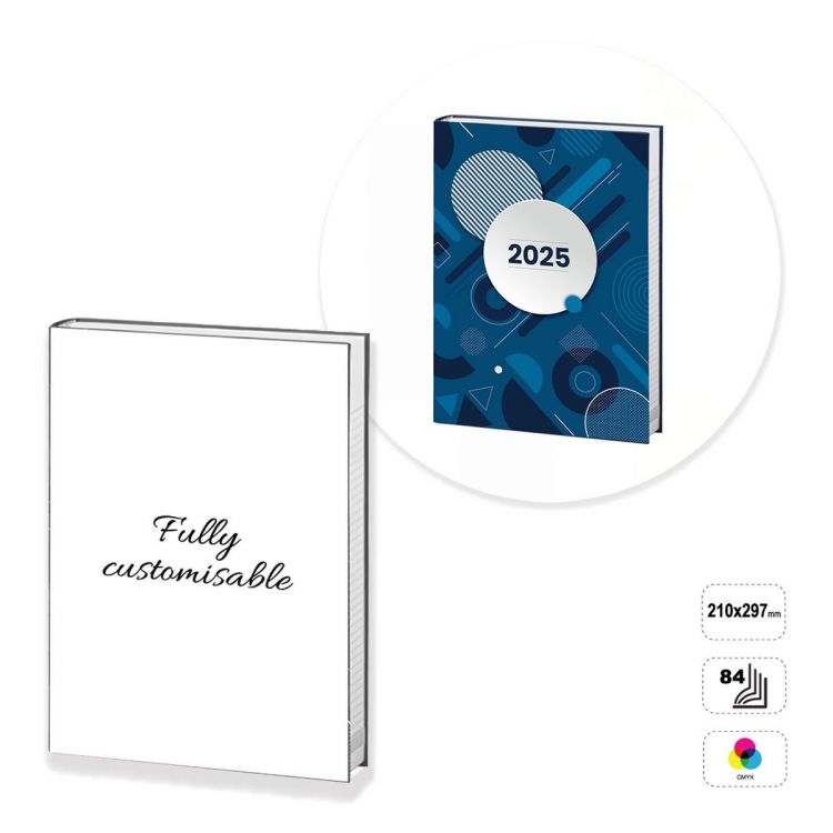 Vollständig individualisierbarer Wochenkalender. Das Produkt besteht aus 84 Seiten (einschließlich Umschlag) aus 90-Gramm-Papier, das einfarbig (schwarz) bedruckt werden kann, und dem Umschlag aus 300-Gramm-Karton mit glänzender Oberfläche, der auf der Vorder- oder Vorder- und Rückseite im Vierfarbendruck bedruckt werden kann. Die Vorderseite kann wahlweise glänzend, matt oder soft touch laminiert werden. Das Produkt wird mit einem gefrästen Taschenbuch hergestellt, einem speziellen Verfahren, bei dem die am Rücken zusammengeklebten Seiten „gefräst“ werden, damit der Klebstoff, der sie zusammenhält, besser eindringen kann und das Produkt sehr widerstandsfähig wird. Das Tagebuch kann individuell gestaltet werden, indem man die voreingestellte Vorlage abändert, oder es kann komplett nach den Vorgaben einer neutralen Vorlage erstellt werden.