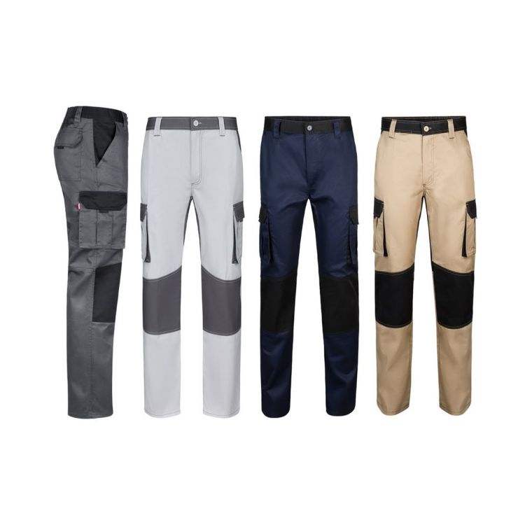 Zweifarbige Multi-Pocket-Twill-Hose (240 g/m²), aus Baumwolle (35%) und Polyester (65%). Slim Fit Schnitt, elastischer Bund und Stoffverstärkung an den Knien und am Rücken. Enthält sechs Taschen (2 französische Taschen, 2 seitliche Zwickeltaschen und 2 Gesäßzwickeltaschen)
