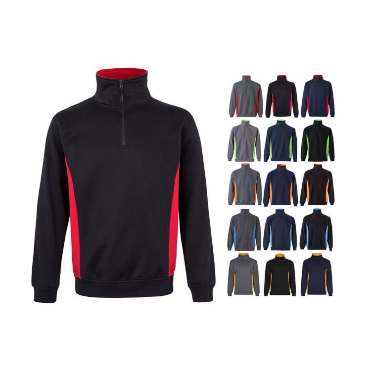 Zweifarbiges Frottee-Sweatshirt (260 g/m²), aus Polyester (65%) und Baumwolle (35%). Mit hohem Kragen und halbem Reißverschluss. Mit Rippenbündchen an Ärmeln und Saum. Anti-Pilling-Behandlung. Seiten und Innenseite des Kragens in Kontrastfarbe