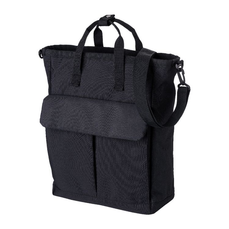 Umhängetasche aus Polyester (900D). Zwei mit Klettverschluss verschließbare Taschen auf der Vorderseite, ein großes Fach mit Reißverschluss auf der Oberseite und ein Fach mit Reißverschluss auf der Rückseite. Mehrere Fächer im Inneren, darunter ein Laptop-Fach (15 Zoll). Die Tasche hat verstellbare Riemen und kurze Tragegriffe.
