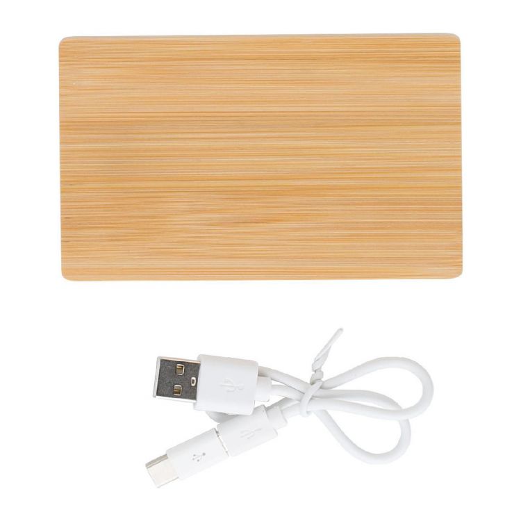 Powerbank aus Bambus mit 4000 mAh Kapazität, 5V/1000 mAh Ein- und Ausgangsleistung, zwei USB-Ports und Verbindungskabel (USB).