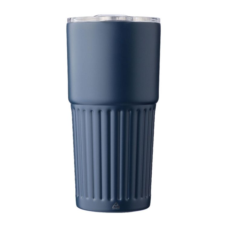 Recycelter doppelwandiger Trinkbecher aus Edelstahl (500 ml). Die Innenseite besteht aus Edelstahl 304, die Außenseite aus Edelstahl 201. Der Becher verfügt über ein geriffeltes Griffdesign. Mit AS-Deckel mit Schiebeverschluss. Auf dem Becher ist ein graviertes Recycling-Logo zu sehen. Der Becher ist einzeln in einem braunen Karton verpackt.