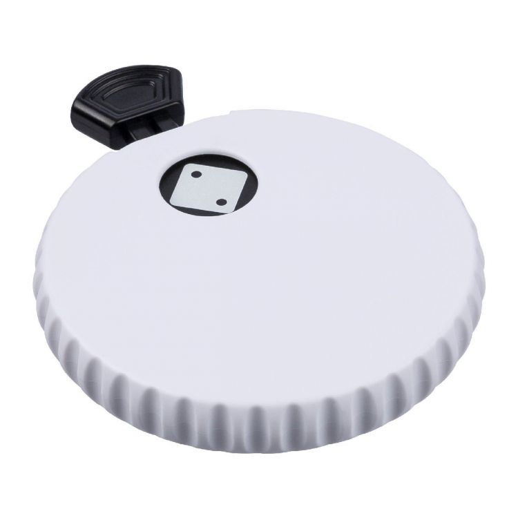 Mechanischer Würfel aus recyceltem ABS verfügt über einen Druckknopf auf seiner Oberseite. Durch Drücken wird der interne Mechanismus aktiviert und eine Zufallszahl zwischen 1 und 6 angezeigt. Auf der Rückseite befindet sich ein Flaschenöffner und ein kleines Recycelt (ABS)-Logo. Der Würfel ist in einem recycelten Polybeutel verpackt.