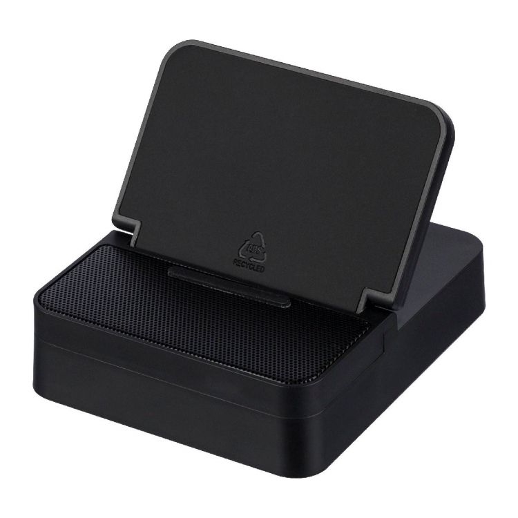 3-in-1-Wireless-Ladegerät, Lautsprecher und Handyhalterung aus recyceltem ABS in würfelförmigem Design. Mit 15-W-Schnellladefunktion, 5-W-Lautsprecherfunktion und Wireless-Connection-Technologie Version 5.4. Mit 1200-mAh-Akku, Metallgitterfront und recyceltem PU-Detail auf der Oberseite. Eingang: 5 V/500 mA. Mit Recycling-Logo gekennzeichnet. Einzeln verpackt in einem braunen Karton.