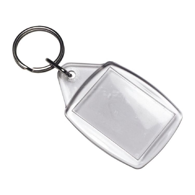 Schlüsselanhänger aus Kunststoff, mit transparentem Fotofenster und Schlüsselring aus Metall. Der Druck erfolgt auf einem Papiereinleger.