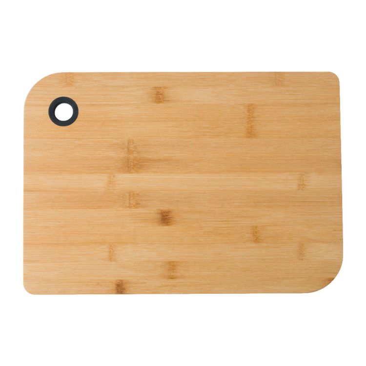 Schneidebrett aus Bambus. Das Daumenloch ist mit einem Silikonring ausgekleidet.
