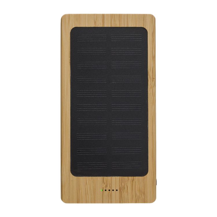Solar-Powerbank aus Bambus mit einer Kapazität von 8.000 mAh, zwei USB-Anschlüssen und einem Mikro-USB-Anschluss sowie vier LED-Anzeigen. Eingang: DC 5V/2A, Ausgang: Gleichstrom 5V/2A. Inklusive Kabel.
