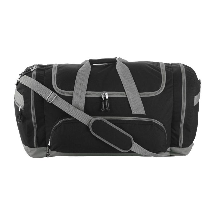 Sport-/Reisetasche aus Polyester (600D), mit RV-Fronttasche und 2 RV-Seitenfächern, Tragegriffen mit Klettverschluss, gepolstertem, verstellbarem Schultergurt und Zipper mit Zugband.