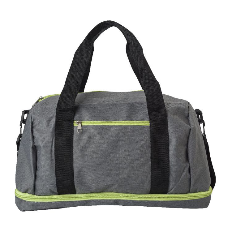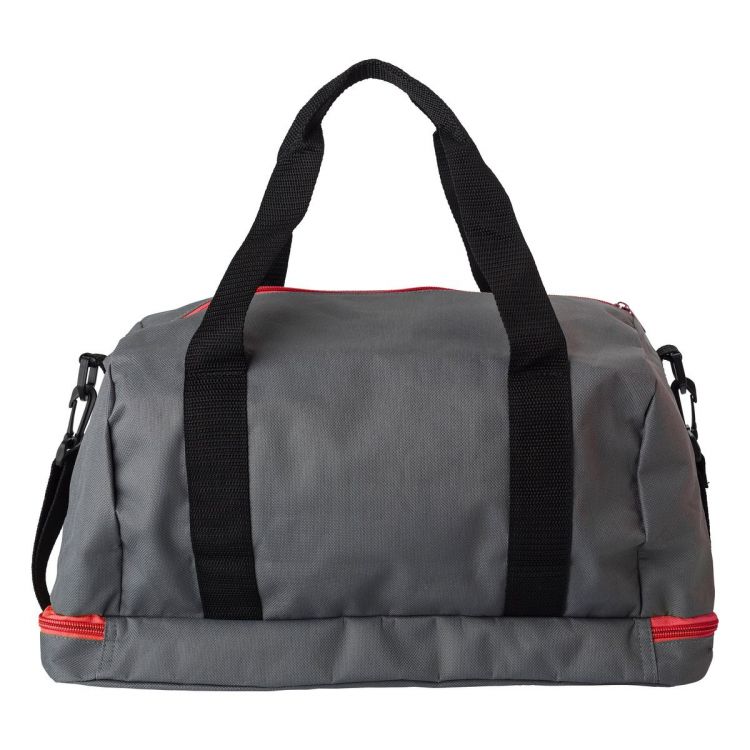 Kleine Sporttasche aus Polyester (600D) mit einer Reißverschlusstasche und einem separaten Schuhfach an der Unterseite. Die Tasche hat zwei Henkel und einen verstellbaren Schulterriemen.