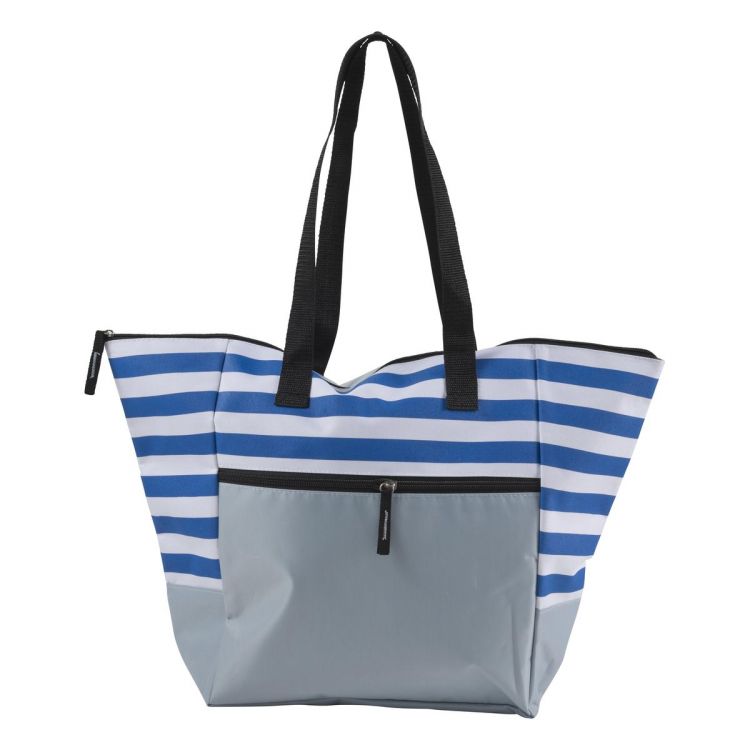 Strandtasche aus Polyester (600D), mit RV-Front- und Hauptfach und schwarzen Tragegriffen.