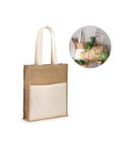 TascheTasche aus einer widerstandsfähigen Kombination aus 240 g/m2 Jute und Baumwollgriffen, alles in Naturtönen. Genähtes Ausführung mit verstärkten mittleren Griffen. Baumwolltasche auf der Vorderseite und Widerstandsfähigkeit bis zu einem Gewicht von 6 kg. (natürlich farbe)