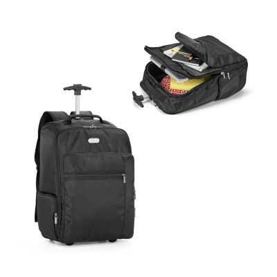 Laptop-Trolley-Rucksack 17'' aus 1680D und 300DTrolley Rucksack aus 1680D und 300D mit vielseitigen Fächern und geschützten Rollen. Das Hauptfach ist ausgkleidet und gepolstert und die ebenfalls gepolsterte Trennwand ist für ein Laptop bis zu 17" geeignet. Dieser Rucksack hat noch 2 Vordertaschen und 2 Seitentaschen, beide mit Reissverschluss. Die Schultergurte sind gepolstert, um das Tragen bequemer zu gestalten. Der Teleskopgriff ist aus Metall und hat eine Feder. Enthält ein abnehmbares und veredelbares Magnet-Metallplättche. Rucksack mit einer Kapazität bis zu 28 l und einem Gewicht von 1,8 kg. Metallplättchen mit Laser veredelbar. Wird separat geliefert, in schwarz farbe