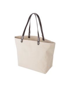 Strandtasche aus PapierStrandtasche aus Polyester mit dunkelbraunen Tragegriffen und Magnetverschluss