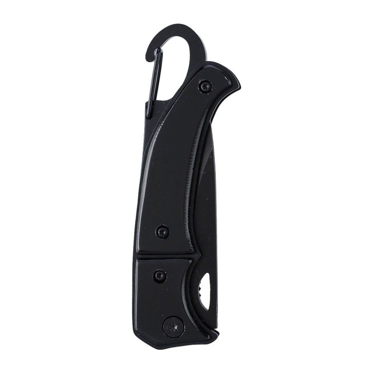Taschenmesser aus rostfreiem Stahl mit Sicherheitsverschluss, Aluminiumgriff und Metallkarabiner. Haftungsausschluss: Karabiner ist nicht zum Klettern geeignet. Einzeln verpackt in einer braunen Pappschachtel.