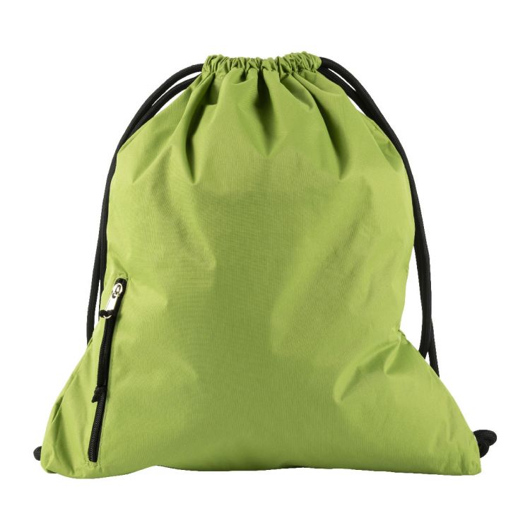 Turnbeutel mit Kordelzug aus Pongee. Die vordere Tasche hat einen Reißverschluss.