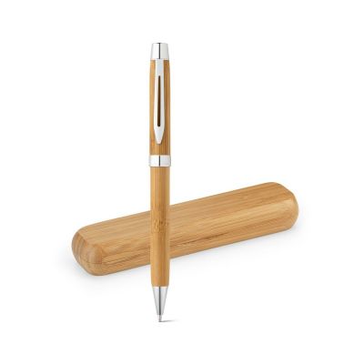 Bambus-SchreibsetElegantes Schreibset aus Bambus und Metall, bestehend aus einem Kugelschreiber und einem Rollerball, verpackt in einer Bambus-Geschenkbox, blauschreibend