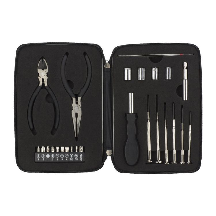 Werkzeug-Set bestehend aus Seitenschneider, Flachzange, Bit-Set (10-tlg.), Pinzette, Schraubendreher, 4 Metall-Nüssen, 6 Feinmechaniker-Schraubendrehern, inklusive Metallbox.
